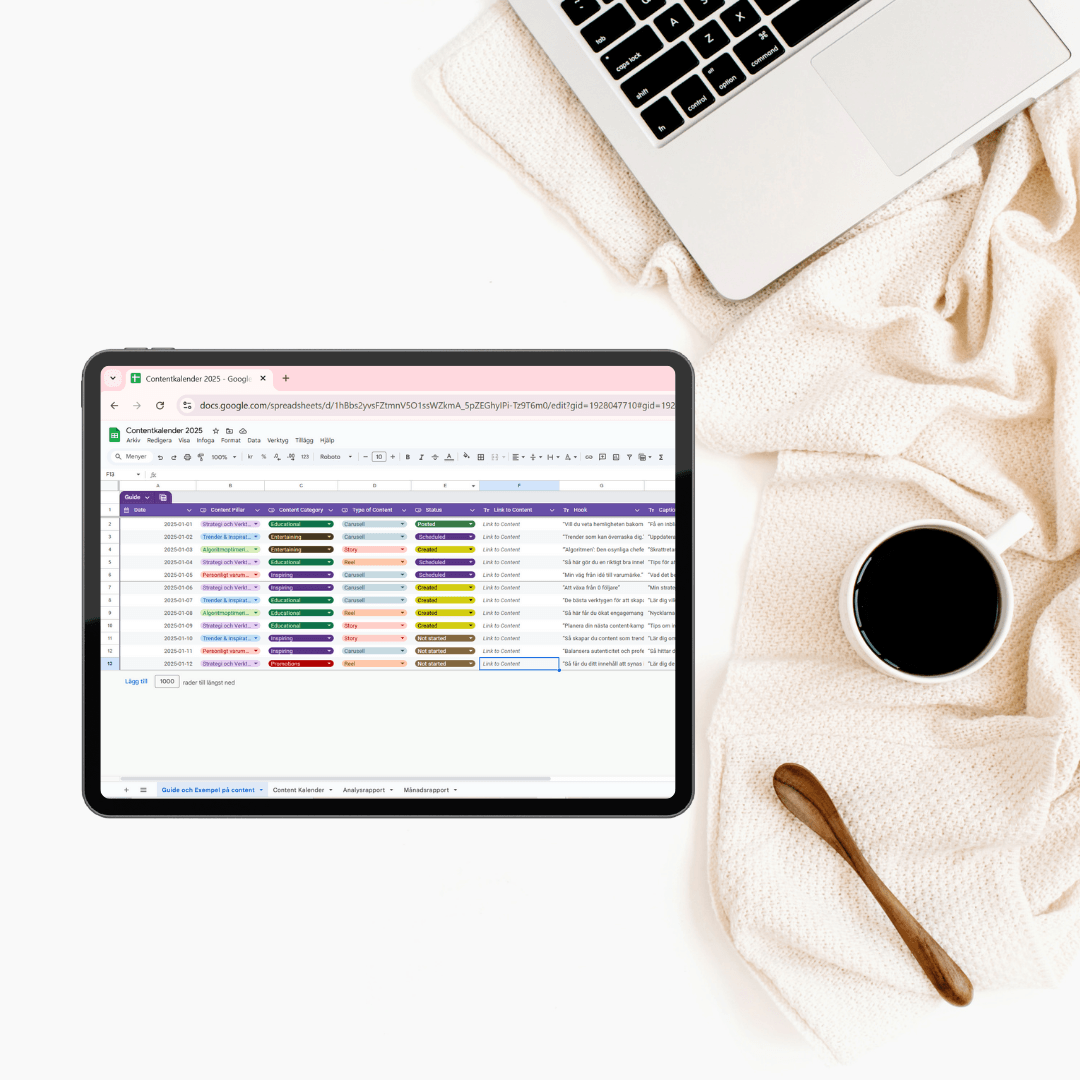 Med Contentkalendern får du en komplett och redigerbar planeringsmall för 365 dagar som hjälper dig hålla koll på dina inlägg, reels och stories – dag för dag, vecka för vecka.